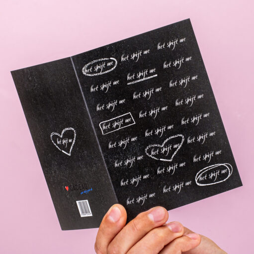 Een vergeten verjaardag of een domme ruzie: excuses komen zoveel beter over als je ze op een kaart schrijft. Laat zien dat je spijt hebt en moeite doet om het goed te maken, met de Wenskaart Het spijt me. Deze kaart in krijtbordstijl is volgeschreven met de woorden ‘het spijt me’. De dubbele kaart heeft meer dan voldoende ruimte om je excuses in op te schrijven. Je kunt je persoonlijke boodschap ook door ons laten schrijven en de kaart rechtstreeks naar de ontvanger sturen.