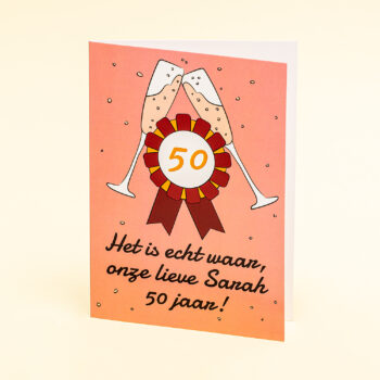 Hiep hiep hoera: een geliefde tante, zus of collega wordt 50 jaar. Een bijzondere leeftijd, waar de meeste mensen uitgebreid bij stil staan. Met de Wenskaart Sarah 50 jaar kun jij de Sarah in kwestie een fijne dag wensen. Op de dubbele kaart staan twee proostende champagne flûtes, een rozet met het getal 50 en de tekst: Het is echt waar, onze lieve Sarah 50 jaar! Je kunt de kaart personaliseren en samen met een cadeautje rechtstreeks naar de ontvanger sturen. Natuurlijk kun je hem ook thuis laten bezorgen en zelf beschrijven.