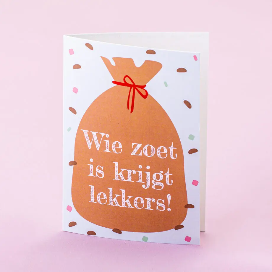 Verras je kinderen rond Sinterklaas met een kaart van de Sint. Wedden dat ze zich nog netter zullen gedragen dan ze sowieso rond deze tijd al doen? De Wenskaart Sinterklaas is een blauwe kaart met een illustratie van de zak van Sinterklaas, met daarom de tekst Wie zoet is krijgt lekkers! Dit kaartje is ook leuk om in de zak te doen bij de rest van de cadeautjes.