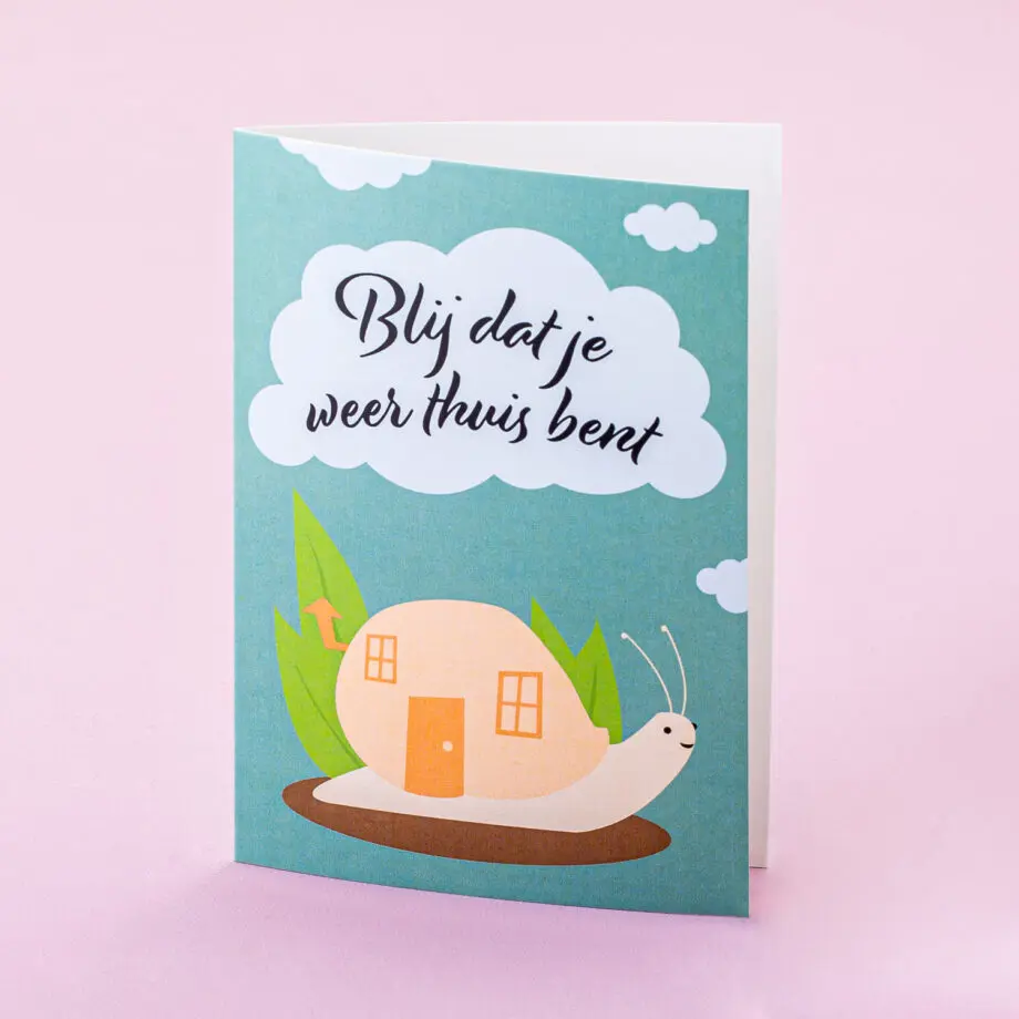 Of iemand nu thuis komt na een lange reis of na een verblijf in het ziekenhuis, het is altijd fijn om weer in de vertrouwde omgeving te zijn. Met de Wenskaart Welkom thuis verwelkom jij iemand thuis die een tijdje van huis is geweest. De kaart heeft een illustratie van een slak met een echt huisje op zijn rug en de tekst: Blij dat je weer thuis bent. De dubbele kaart heeft een blanco binnenkant met voldoende ruimte voor een persoonlijke boodschap.