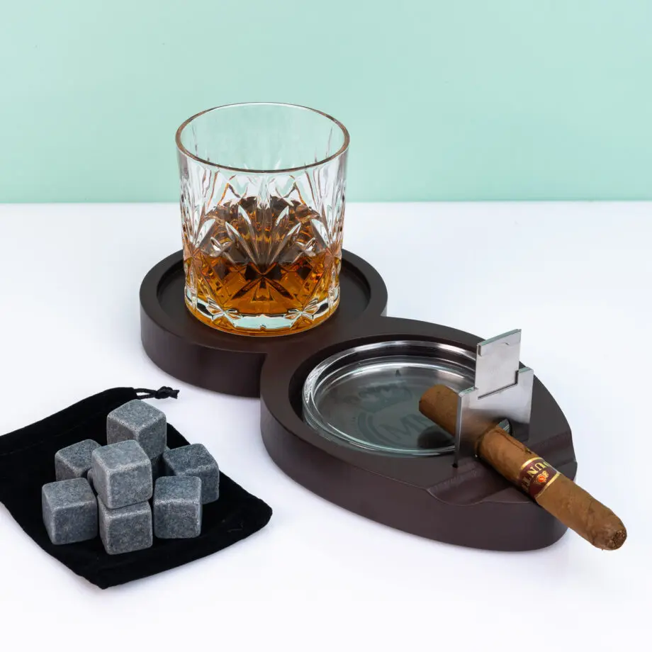 - Inhoud: whiskeyglas, houten dienblad, asbak, sigarensnijder, negen whiskey stones in velvet zakje