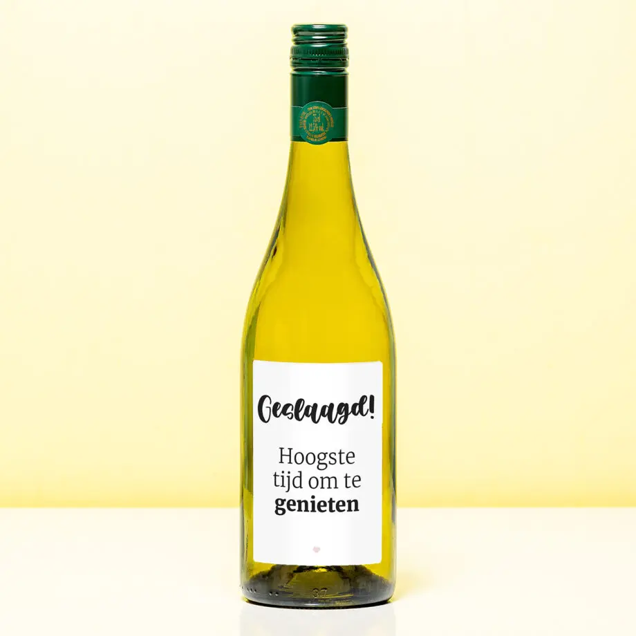 Na maanden zwoegen boven de studieboeken is het zover: de examens zijn voorbij en je bent geslaagd. Dat vraagt om een feestje! De Wijnfles Geslaagd tijd om te genieten is een leuk cadeautje voor iedereen die hard heeft gewerkt en nu een tijdje gaat genieten van zijn of haar vrije tijd. Lekker reizen, een tijdje luieren of direct aan de slag: alles wordt leuker met een flesje wijn erbij.