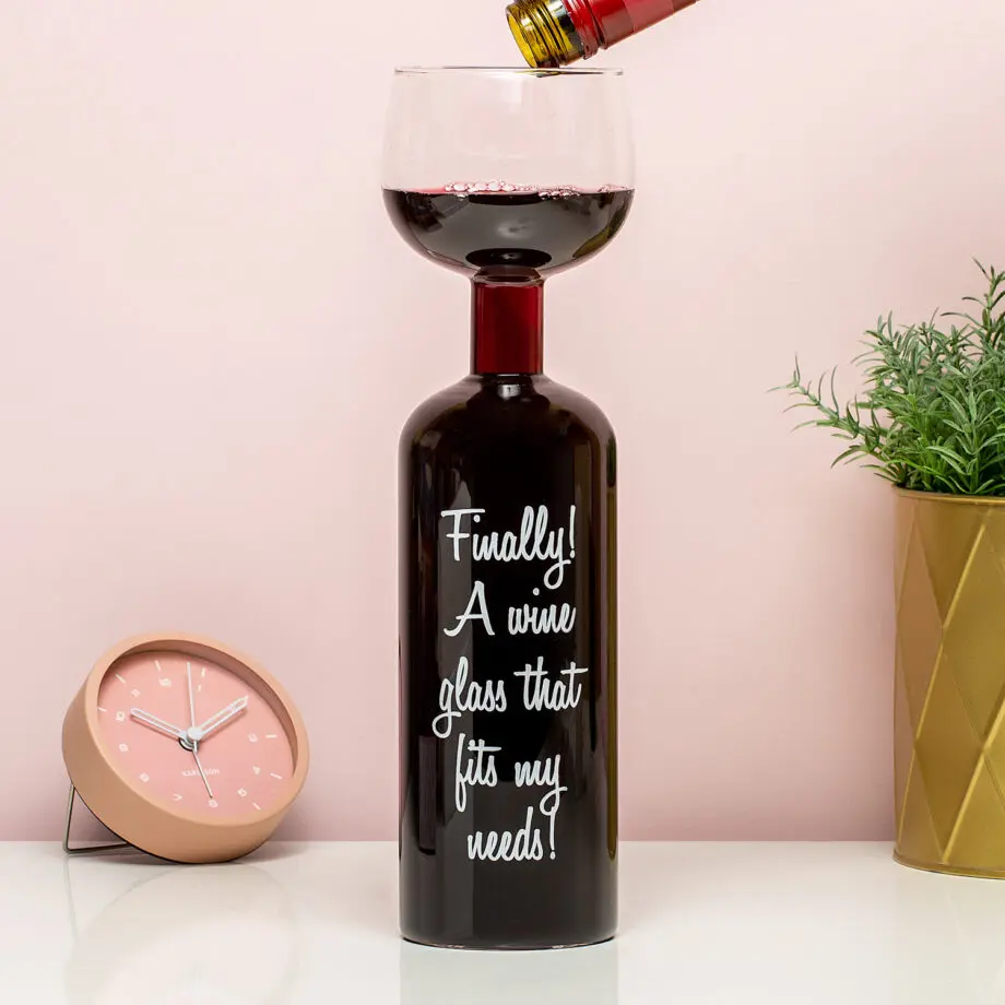Een glaasje wijn per dag schijnt helemaal niet ongezond te zijn. Sterker nog: onderzoekers noemen het gezond. Als je liever niet gek aangekeken wilt worden, omdat je je glas voor de tweede, derde of vierde keer bijschenkt, dan is het Wijnfles wijnglas je op het lijf geschreven. Het Wijnfles wijnglas is een fles wijn en glas in รฉรฉn. Hierdoor loopt je glas automatisch vol en kun je wijn blijven drinken. Samen hebben de fles en het glas een inhoud van maar liefst 750 milliliter. En dat is toch wel een wijntje of twee of drie. Dit wijnglas is al jaren een hit als cadeau voor Moederdag, vrijgezellenfeestjes, met kerst of als cadeau voor haar.