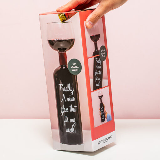 Een glaasje wijn per dag schijnt helemaal niet ongezond te zijn. Sterker nog: onderzoekers noemen het gezond. Als je liever niet gek aangekeken wilt worden, omdat je je glas voor de tweede, derde of vierde keer bijschenkt, dan is het Wijnfles wijnglas je op het lijf geschreven. Het Wijnfles wijnglas is een fles wijn en glas in één. Hierdoor loopt je glas automatisch vol en kun je wijn blijven drinken. Samen hebben de fles en het glas een inhoud van maar liefst 750 milliliter. En dat is toch wel een wijntje of twee of drie. Dit wijnglas is al jaren een hit als cadeau voor Moederdag, vrijgezellenfeestjes, met kerst of als cadeau voor haar.