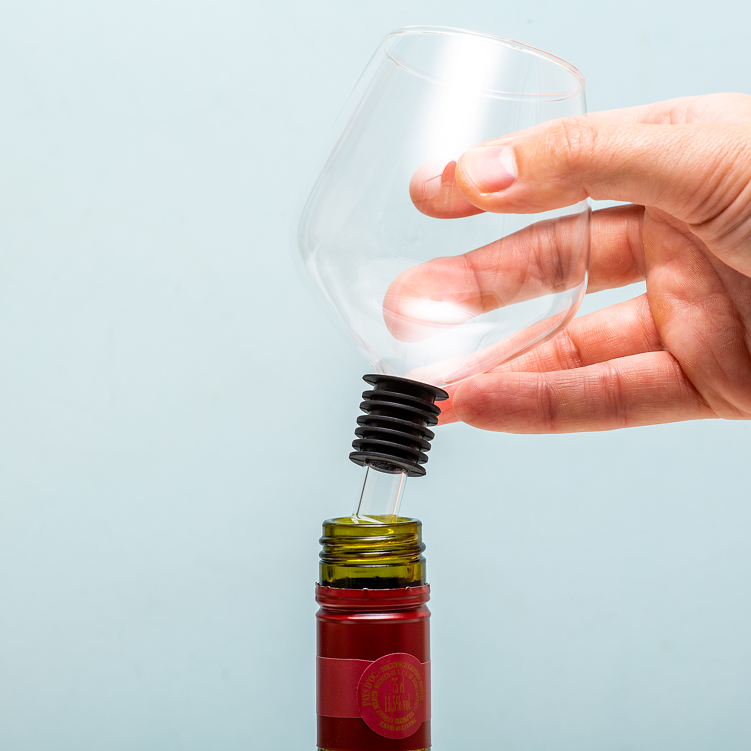 Als je je wijn even laat luchten, dan komen er nog meer smaken en aroma’s vrij. Dat luchten, of decanteren, doe je met de Wijnglas decanteerder. Deze originele decanteerder ziet eruit als een wijnglas. Door de siliconen rand voorkomt je morsen. Voortaan schenk jij je wijn uit een wijnglas.