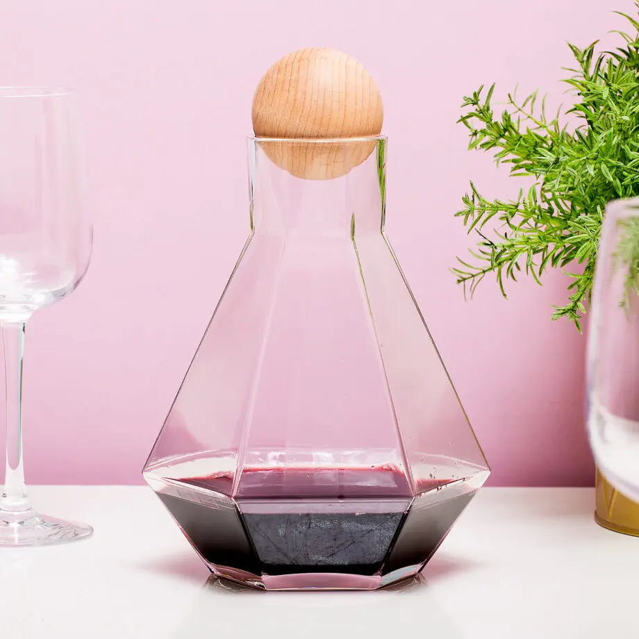 Een wijnkaraf geeft je gedekte tafel een extra chique uitstraling. Bovendien zorgt zoโn karaf ervoor dat je wijn kan luchten en dus extra aromatisch smaakt. De Wijnkaraf in diamantvorm van Out of the Blue is een karaf met een inhoud van 1300 milliliter: je kunt er met gemak een fles wijn in kwijt. Heeft hij genoeg gelucht, dan kun je de karaf afsluiten met de houten bal.