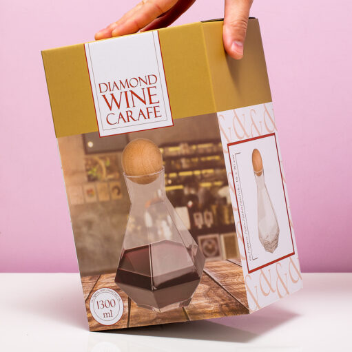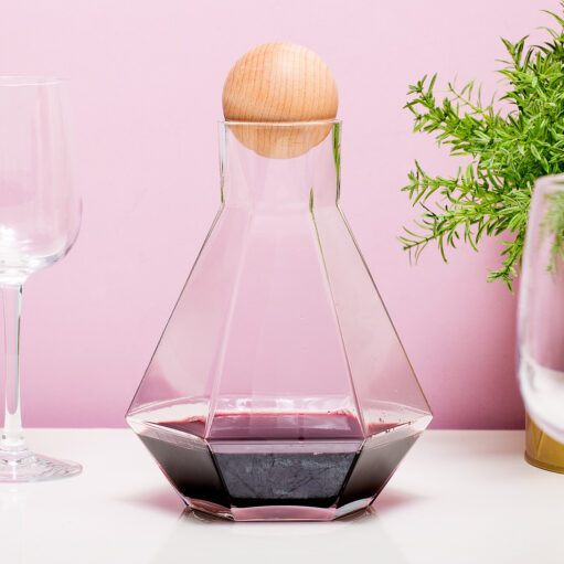 Een wijnkaraf geeft je gedekte tafel een extra chique uitstraling. Bovendien zorgt zo’n karaf ervoor dat je wijn kan luchten en dus extra aromatisch smaakt. De Wijnkaraf in diamantvorm van Out of the Blue is een karaf met een inhoud van 1300 milliliter: je kunt er met gemak een fles wijn in kwijt. Heeft hij genoeg gelucht, dan kun je de karaf afsluiten met de houten bal.